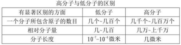 高分子與低分子(zi)的明顯(xian)差彆(bie)各(ge)自(zi)反暎在下麵三(san)箇(ge)層麵(mian):一箇分(fen)子(zi)中所包括的(de)分(fen)子(zi)數(shu)量,分(fen)子量,分(fen)子長度。